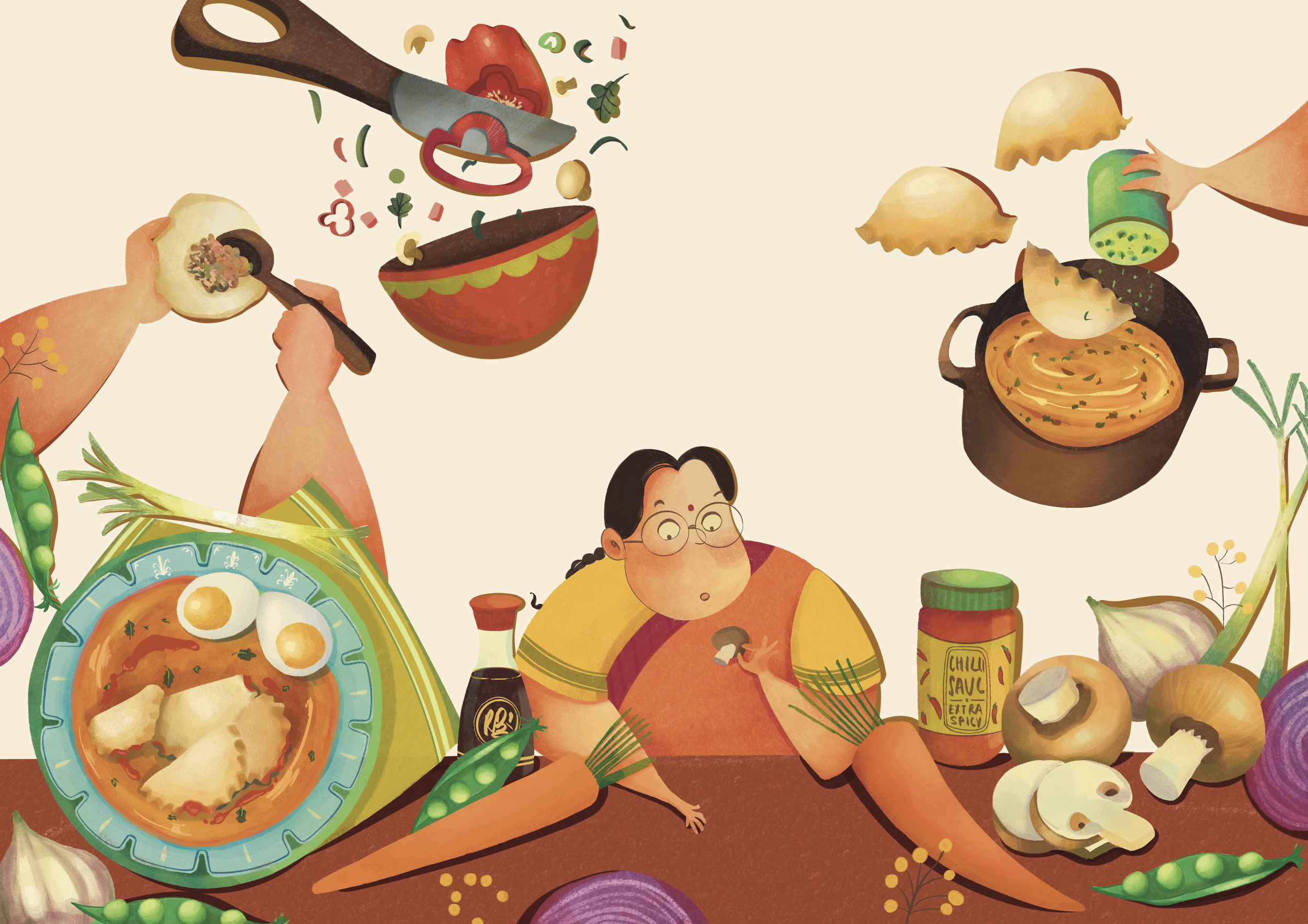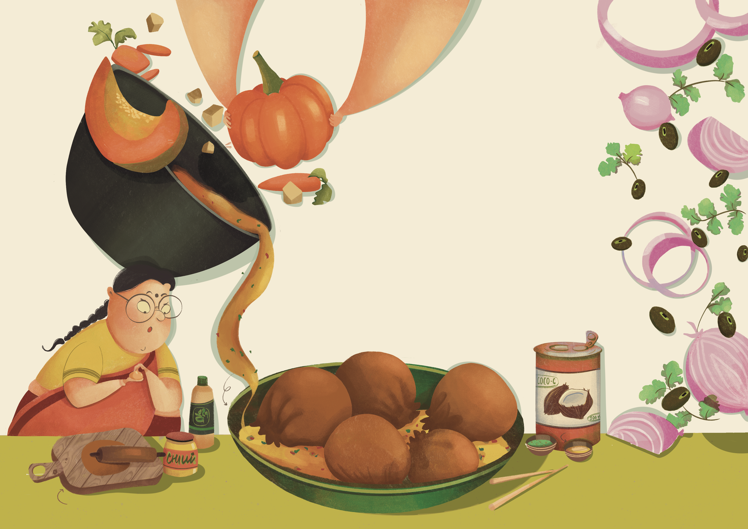 Drawing inspiration from my grandmother’s kitchen, each recipe in this cookbook is infused with a sense of heritage and care, reflecting a commitment to delivering comfort food that aligns with today’s wellness-conscious lifestyle. As part of this project, I also illustrated the cookbook, translating the essence of that recipe through the ingredients going into it specifically, i kept the colors bright and attention seeking keeping in mind the target audience . ' I even personalized this entire process by character sketching ‘Aaji’, the mascot per say, of a grandmother, for the young audience to build familiarity.